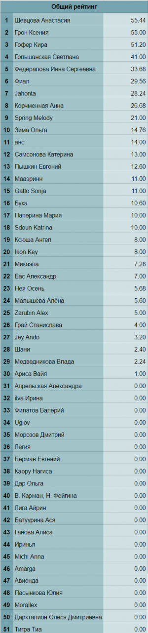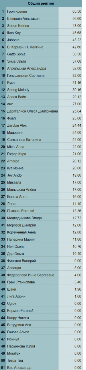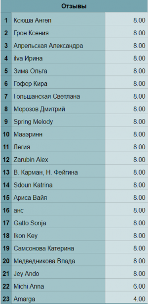 Подробные итоги отзывов Ариса подводила отдельно, так что я просто укажу, как оно отразилось на рейтинге.