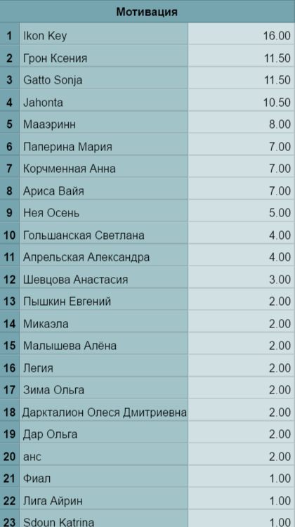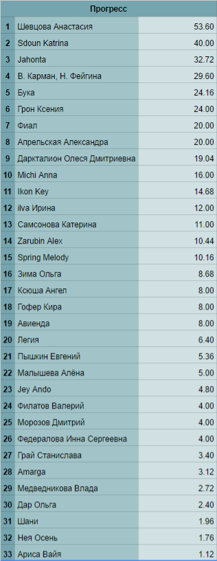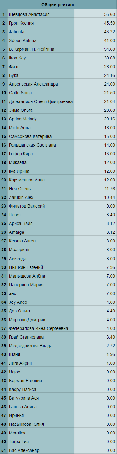 И, наконец, общий суммарный рейтинг по всем активностям, встречаем «топ» этого месяца: