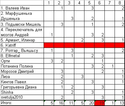Автор миниатюры № 6, к сожалению, не проголосовала, и ее результат не засчитывается.