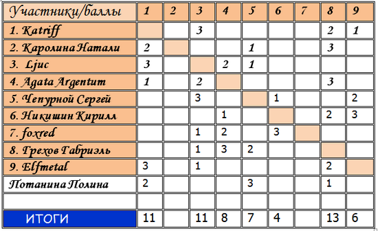 2 место разделили Katriff и Ljuc — по 11 баллов.