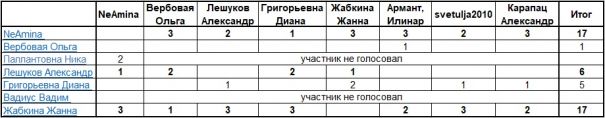Первое место с абсолютно равным количеством очков и полученных голосов делят Жабкина Жанна и NeAmina!