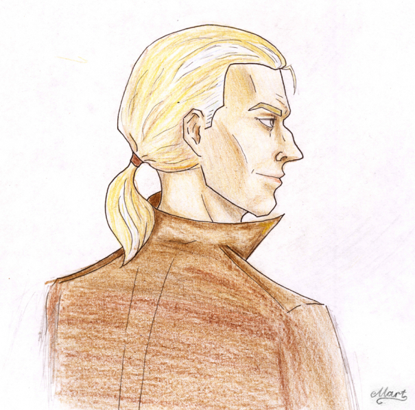 Объективное описание внешности: Высокий мужчина со светлыми, кое-где седыми волосами, которые обычно забирает в тугой недлинный хвост. У него худое лицо с острыми скулами, тёмные круги под глазами, хищный нос с горбинкой, тонкие губы.