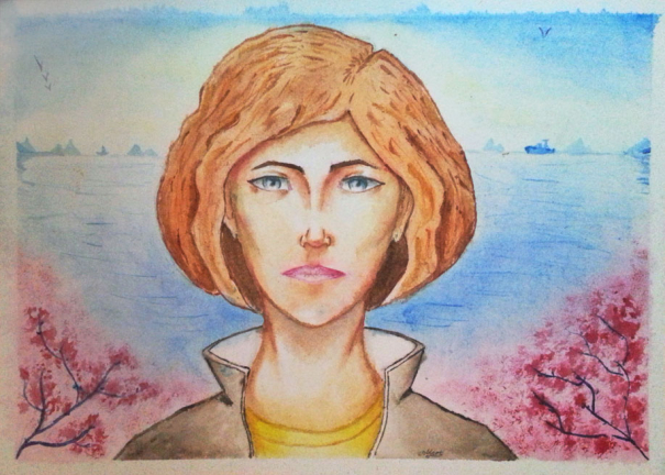 Объективное описание внешности: Худощавая девушка с волнистыми каштановыми волосами длиной чуть ниже уха. Синие глаза, непропорционально широкий рот, которого она стесняется, тонкие длинные пальцы.