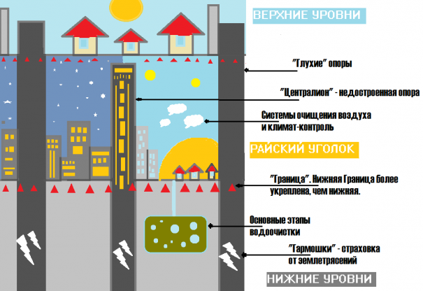 — Верхние уровни (основные правительственные здания и здания Имперских советов; большие пространства, живое небо, силовой купол для удержания атмосферы).