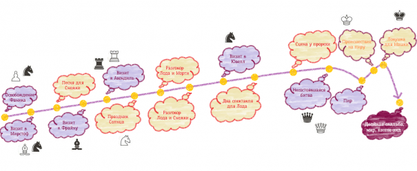 Сиреневые облачка — первая линия, красно-бежевые — вторая. Последние три события другого цвета, ибо там линии сливаются воедино. Шахматные фигурки — мои личные обозначения, кто при этом делает ход в партии светлых и тёмных… и кто остаётся в выигрыше.
