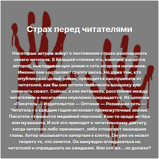Как оказалось, именно это беспокоило меня год назад. Была поправка, не читателя, а бета-тестеров, но, признаем на берегу, бета-тестеры единственные, кто меня читает. Их недовольство пугало куда больше, чем мнение случайного человека, пришедшего в текст от скуки или участия в литературных сабантуях.