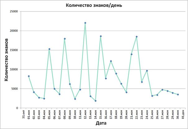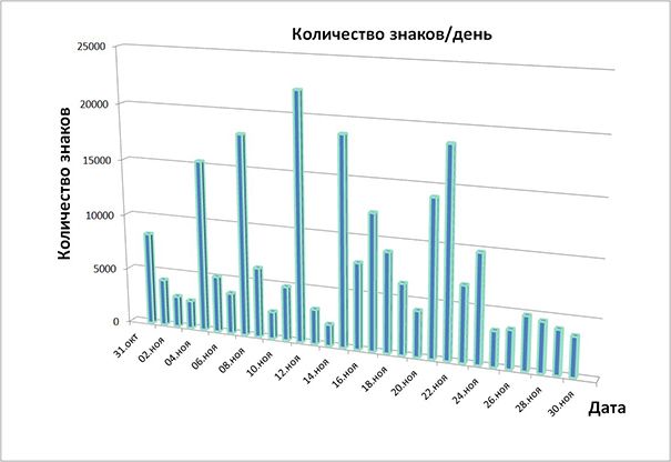 Прошел месяц, и я хочу сказать пару слов о своем прогрессе. В общем-то не особо прогресс, кому-то покажется совсем наоборот, но я чувствую иначе. Считаю, что поработала продуктивно, и именно благодаря тому, что вела табличку. Первые несколько дней заставляла себя, а потом как-то само собой пошло-поехало… Да, я правила текст, поэтому цифры несколько разнятся, но это потому, что над каким-то отрывком приходилось работать дольше, скрупулезнее, а какие-то как по маслу редактировались. К чему я? А к тому, что мне понравилось И на декабрь я сделала себе точно такую-то табличку-пинок)))С ней мне быстрее работается.