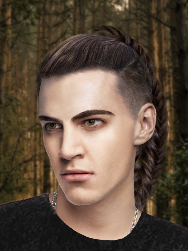 Длинные черные волосы, заплетенные в четыре косы, телосложение – м… зверское))), глаза цвета зеленоватой бронзы, при гневе светятся оранжевым. Смел до безрассудства. Живет в мире, соприкасающимся тонкой гранью с человеческим. Неожиданно для себя привязался к человеческой девушке, немного рассказывает о своем мире, учит взаимодействию, пытается ее опекать – конфликт с людьми.