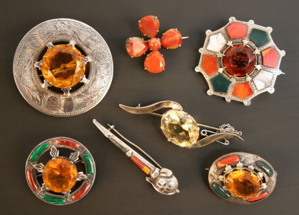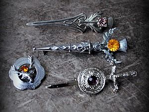 Самыми древними шотландскими украшениями являются круглые и массивные пледовые броши — на протяжении многих веков ими закалывали пледы, непременная деталь костюма. А потому они неизменно красовались на плечах суровых шотландцев. Пледовые броши — одни из самых ярких мужских украшений. Как правило их делали из серебра или сплава под серебро и украшали натуральными камнями — агатами, аметистами, цитринами. И даже простой серовато-бежевой галькой с побережья: подобные камни идеально дополняли и без того яркие образы шотландских воинов и прекрасно сочетались с пестрой клеткой костюма.