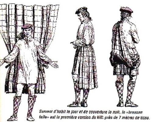 Большой плед — шерстяная ткань оборачивалась вокруг бедер, а оставшийся конец перекидывался через левое плечо. Такой плед был исключительно мужской одеждой.