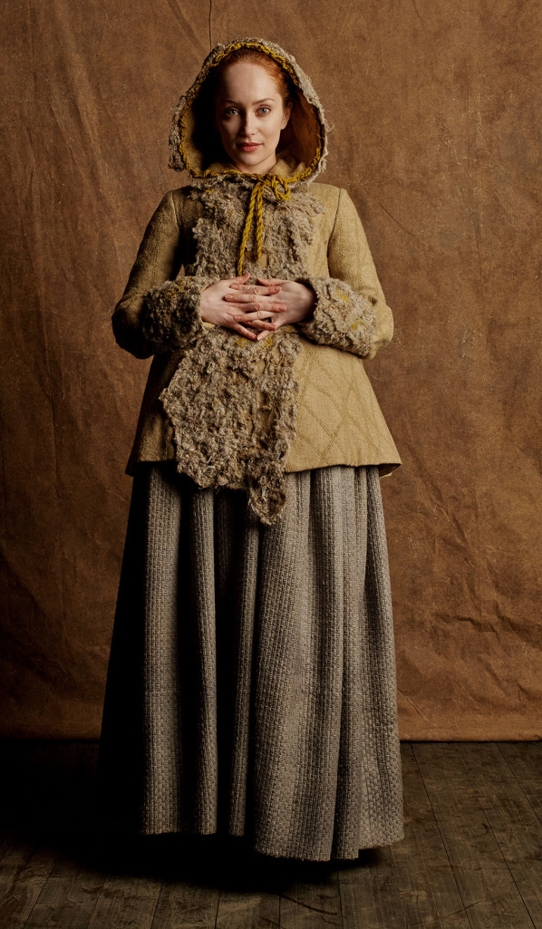 «Подошедший Дунстан окинул взглядом бывшую невесту. Он был ошеломлен дорогим нарядом девушки, состоявшим из белой блузы обшитой кружевом, шерстяной, длинной юбки и передника, украшенного тесьмой. Ее талию облегал широкий пояс, расшитый узорами из драгоценных камней и отделанный латунными пластинками».