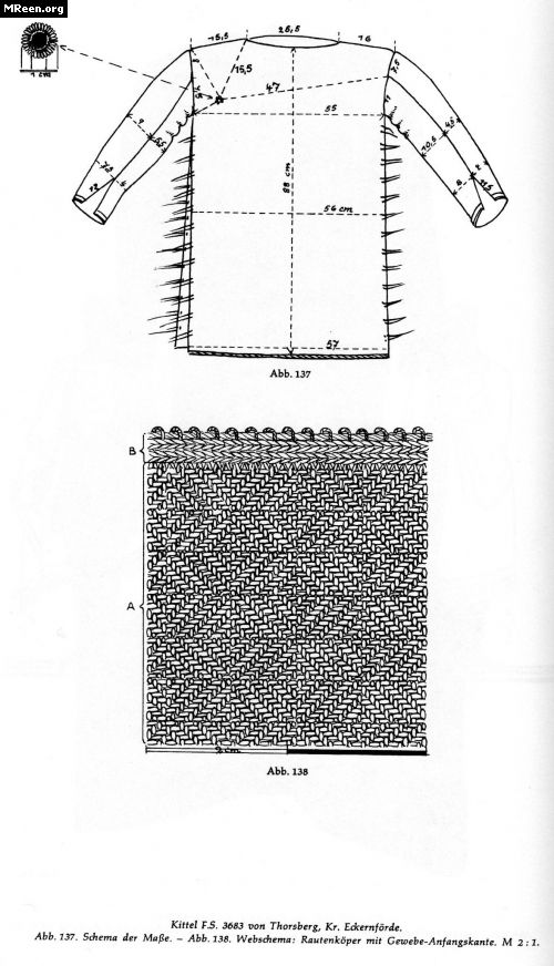 Рубаха была сшита из четырех кусков: передняя и спинная части, сшитые в плечах и два рукава. Вырез на вороте отсутствует: просто оставлено отверстие для головы. Каждый рукав сужался по направлению к кисти, но не из-за покроя рукава, но более узкого сшивания конца рукава. Рукав с узким манжетом был довольно длинным.