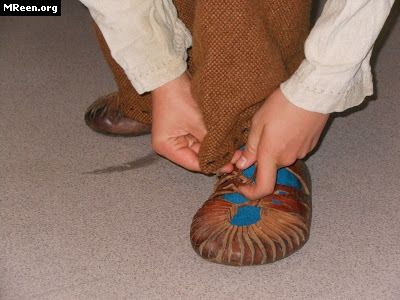 В качестве обуви были болотные башмаки и теплые обмотки из любой шерстяной ткани натуральных цветов или из овчинной шкуры. «Благородные» мужчины носили сапоги.
