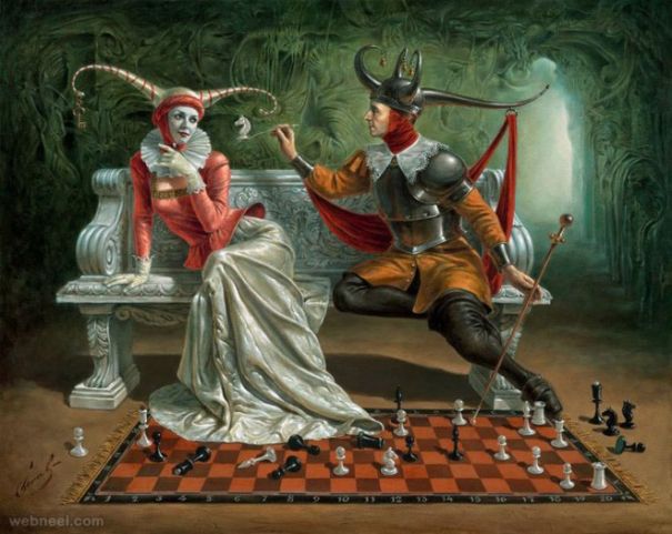 Мы все заложники игры характера, амбиций, вожделенья. Отрывки грустных и веселых сцен гамбит выводят на жизни шахматной доске. Вот дама, королева белых, пытается переиграть мужчину-черного ферзя в роскошной зале с вычурной лепниной, расписанном узорами. На каменной скамье с резными ножками и спинкой, она сидит одетая в костюм роскошный. Блузка цвета мака с гофрированным воротником, юбка в пол, на голове колпак. Почти корона. Блестяще-золотистый, переплетенный алой лентой, с длинными рогами, загнутыми вниз. На правом – ключик от ячейки в банке. Для мужчины желанный приз. Переполненный азартом, он наступает. Игриво улыбаясь, дама, в кулачке зажав свою защиту – интригу-пешку, выжидает. Ударить хочет побольней. Мужчина – франт в оранжевой рубашке с железными манжетами и кружевном воротничке, присел на край скамейки. В рогатом черном шлеме с бубенцами он – словно хозяин жизни. Протянув на чайной ложке фигурку белого коня-фантом любви, усмехается лукаво. Хочет обменять его на пешку. И выиграть игру!