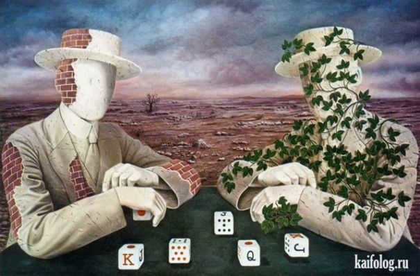 После того самого фатального взрыва мир начал постепенно разрушаться. Ржаво-багровая бесплодная пустошь, присыпанная камнями – останками города, простирается за горизонт, сливаясь с мрачно синеющим, как кожа покойника, небом. Под клубящимися облаками дыма сидят двое. Опираясь на стол локтями, застыли, погрузившись в задумчивость или воспоминания. Ни один не торопится сделать следующий ход, от которого может зависеть судьба шаткого равновесия нынешнего момента. Разбросанные перед окаменевшими фигурами в шляпах и костюмах игральные кости складываются в странную комбинацию, в которой чего-то не хватает. Кто же поставит последнюю точку – сидящий слева бывший фабрикант, еще не растерявший остатки светского лоска и кирпичной облицовки, или расположившийся напротив соперник, будто прячущий саркастическую ухмылку под густыми зарослями плюща, змеящегося по его растрескавшемуся фасаду?