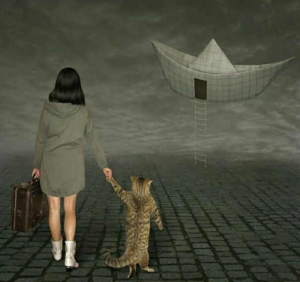 Осторожно взяв кота за лапку, девочка зашагала по квадратным плиткам, похожим на печенье, которыми была выложена площадь. Кот послушно пошел за ней: светло коричневый, с черной полосой между ушами, похожей на челку, зачёсанную назад и растекающуюся по шее прядями-полосками, которые маленькими, волнистыми змейками разбегались по туловищу, затем обвивая пушистый хвост кота кольцами. Его задние лапки – черные, как будто по ним мазнули кистью, выпачканной в краске. Девушка одета в серое платье с капюшоном и длинными рукавами, белые полусапожки на каблучке с серебряной полосой, и напоминает подростка. Ее черные, тщательно уложенные волосы скрыли шею. Держа в руках старомодный, потертый чемоданчик, с блестящими замками, она направилась к бумажному кораблику, сделанному из листка в клетку. Кораблик приплыл по темно-серым волнам туч, затянувшим небо до самого горизонта и готов забрать девушку и кота. Им надо лишь подняться по спущенной, белой веревочной лестнице и шагнуть в темноту входа.