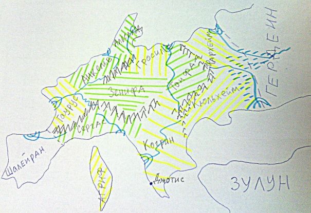 Здесь не очень хорошо видно, но азиаты пришли с востока, захватив Кюльхейм, Когрин и Сергас, после чего двинулись к Зенифе и Тонфе. Там им надрали зад, а потом вообще зенифцы отвоевали половину Когрина назад, отрезав азиатов от их исторической родины. Плюс Кюльхейм восстал против захватчиков, когда те утратили стратегическое преимущество, и прародина азитов на время забыла о своей далёкой территории, а потом и вовсе развалилась как страна.