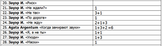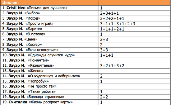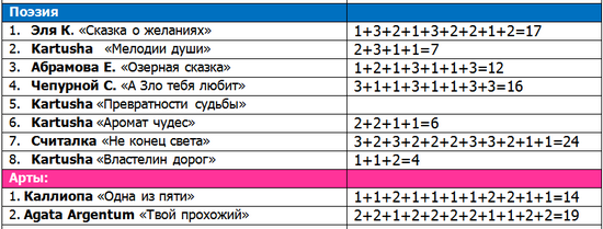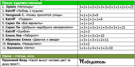 По закону коварного случая / ПОБЕДИТЕЛИ (73) Зауэр Ирина 26 февраля 2016, 15:10 0 Список участниковПроза художественная1. Opiate «Нетопырь» 2. Katriff «Любовь к музыке»3. Чепурной С. «Конец проклятой улицы»4. Katriff «Подарок»5. Сарко Ли «Все варианты»6. Сарко Ли «Добрыми недобрыми намерениями»7. Katriff «Ошибка»8. Елена Лев «Лабиринт»9. Абрамова Елена «Девочка и звезда»10. Бородец «Недодумали»11. Каллиопа «Хэппи» Проза – статьи, эссеПрохожий Влад «Какой выкуп человек даст за душу свою?» Поэзия1. Эля К. «Сказка о желаниях»2. Kartusha «Мелодии души»3. Абрамова Е. «Озерная сказка»4. Чепурной С. «А Зло тебя любит»5. Kartusha «Превратности судьбы»6. Kartusha «Аромат чудес»7. Считалка «Не конец света»8. Kartusha «Властелин дорог»Арты:1. Каллиопа «Одна из пяти»2. Agata Argentum «Твой прохожий» Циклон:1. Cristi Neo «Письмо для лучшего»2. Зауэр И. «Выбор»3. Зауэр И. «Исход»4. Зауэр И. «Просто играй»5. Зауэр И. «Дарите»6. Зауэр И. «В потоке»7. Зауэр И. «Цена»8. Зауэр И. «Костер»9. Зауэр И. «Если оглянуться»10. Зауэр И. «Однажды случится чудо»11. Зауэр И. «Помечтай»12. Зауэр И. «Разночтенья»13. Зауэр И. «Живое»14. Зауэр И. «О чудовищах и лабиринтах»15. Зауэр И. «Попробуй»16. Зауэр И. «Не просто так»17. Зауэр И. «Такая работа»19. Зауэр И. «Баллада странника»19. Считалка «Жизнь раскроет карты»20. Зауэр И. «Риск»21. Зауэр И. «Не ждали?»22. Зауэр И. «Не так»23. Зауэр И. «По дороге»24. Зауэр И. «Не жду»25. Agata Argentum «Когда замирают звуки»26. Зауэр И. «Я, а не ты»27. Зауэр И. «Уходи»28. Зауэр И. «Маски» Внеконкурс, проза и поэзия1. Зауэр И. «Сказка о двух мирах»2. Зауэр И. «Выходной для ангела»3. Зауэр И. «Если»4. Зауэр И. «Один из трех»5. Влад Прохожий «Илья Муромец — возвращение богатыря»7. Shinha «Не хватай что попало»6. Зауэр И. «Дно твоего колодца»8. Считалка «Рожаница» таблицы