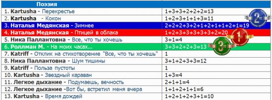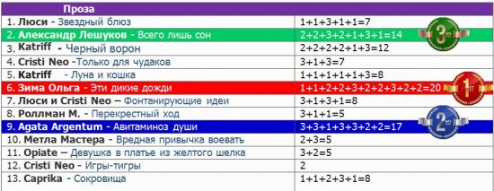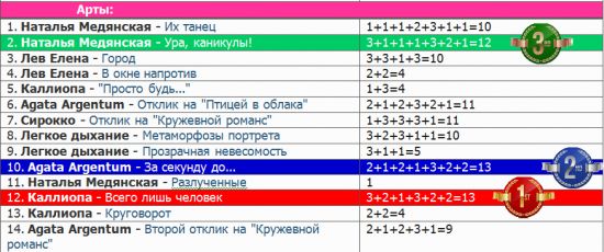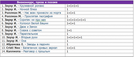 Собрать мозаику / **Победители** (78) Зауэр Ирина 13 марта 2017, 11:41 1 Работы и участники• Конкурс. Проза1. Люси — Звездный блюз2. Александр Лешуков — Всего лишь сон3. Katriff — Черный ворон4. Cristi Neo -Только для чудаков5. Katriff — Луна и кошка6. Зима — Эти дикие дожди7. Люси и Cristi Neo — Фонтанирующие идеи8. Роллман М. — Перекрестный ход9. Agata Argentum — Авитаминоз души10. Метла Мастера — Вредная привычка воевать11. Opiate – Девушка в платье из желтого шелка12. Cristi Neo — Игры-тигры13. Caprika — Сокровища • Конкурс. Поэзия1. Kartusha — Перекрестье2. Kartusha — Кокон3. Наталья Медянская — Зимнее4. Наталья Медянская — Птицей в облака5. Ника Паллантовна — Все, что ты хочешь6. Роллман М. — На моих часах…7. Katriff — Отклик на стихотворение «Все, что ты хочешь»8. Ника Паллантовна — Шум тишины9. Katriff — Польза пустоты10. Kartusha — Звездный караван11. Легкое дыхание — Подумаешь, вечность12. Легкое дыхание — Вот бы, встретил меня вчера13. Kartusha — Время дождей • Конкурс. Арты1. Наталья Медянская — Их танец2. Наталья Медянская — Ура, каникулы!3. Лев Елена — Город4. Лев Елена — В окне напротив5. Каллиопа — «Просто будь...»6. Agata Argentum — Отклик на «Птицей в облака»7. Сирокко — Отклик на «Кружевной романс»8. Легкое дыхание — Метаморфозы портрета9. Легкое дыхание — Прозрачная невесомость10. Agata Argentum — За секунду до…11. Наталья Медянская — Разлученные12. Каллиопа — Всего лишь человек13. Каллиопа — Круговорот14. Agata Argentum — Второй отклик на «Кружевной романс» • Внеконкурс1. Зауэр И. — Кружевной романс2. Зауэр И. — Ночной блюз3. Роллман М. — Нас всех принесли из морга4. Роллман М. — Проклятая география5. Зауэр И. — Скрипач ни при чем6. Зауэр И. — Колокол Белой Башни7. Зауэр И. — Двое и Замок8. Зауэр И. — Сказка с советом9. Зауэр И. — Параллельное10. Зауэр И. — Вторые руки11. Зауэр И. — Она12. Абрамова Е. — Звезды в ладонях13. Cristi Neo — Балаганчик кривых зеркал14. Каллиопа — Разговор с прошлым Таблицы результатов