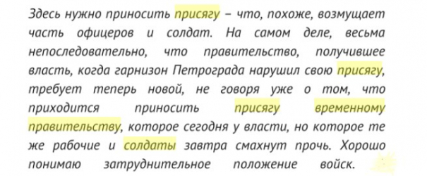 «Врем. правительство не располагает какой-либо реальной властью, и его распоряжения осуществляются лишь в тех размерах, кои допускает Совет раб. и солд. депутатов, который располагает важнейшими элементами реальной власти, так как войска, железные дороги, почта и телеграф в его руках. Можно прямо сказать, что Врем. правительство существует, лишь пока это допускается Советом раб. и солд. депутатов. В частности, по военному ведомству ныне представляется возможным отдавать лишь те распоряжения, которые не идут коренным образом вразрез с постановлениями вышеназванного Совета.»