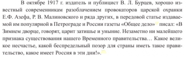 Ещё одно странное заявление… В состав третьего коалиционного кабинета ВП входили три меньшевика и два эсера (включая Керенского). Их однопартийцы заседали вместе с большевиками в Советах, издавали печатные органы своих партий, а обстановка в воинских частях Петроградского гарнизона отнюдь не была тайной ни для кого. Несомненны контакты членов ВП со старыми своими знакомыми и соратниками по революционной деятельности — многие из министров при царизме были осуждены в разное время, будущий министр финансов Бернацкий сотрудничал с легальными марксистскими журналами, министр юстиции Малянтович известен своими участиями в качестве адвоката в громких процессах времён самодержавия над РСДРП (защита Баумана и Стасовой, Троцкого, Воровского, Рожкова, Московского комитета РСДРП, выигрыш 100 тыс руб, завещанных той же партии Саввой Морозовым и т.д.). Тем более, что и среди социалистов и кадетов в составе самого кабинета не было не только чёткого плана удержания власти, но и единомыслия. Морской министр Вердеревский, например, будучи до того командующим Балтийским флотом, отказался во время июльского кризиса выслать корабли для защиты ВП и подал в отставку, но был затем приглашён уже на роль министра… «Слабая информированность» Смольного? Успешность восстания говорит о другом. Так же и неспособность ВП к обороне не была неким великим секретом. Скорее, у большевиков шла подготовка не к свержению мало что решавшего уже органа, а к захвату власти ВО ВСЕЙ ПОЛНОТЕ.