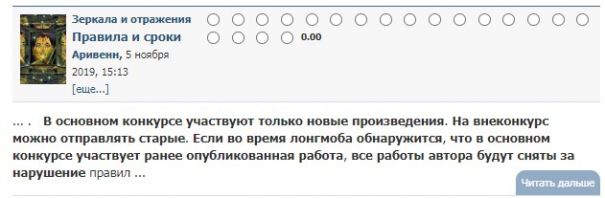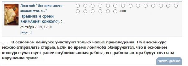 В «Положении о проведении» нет прямого запрета на включение в конкурсные номинации лонгмобов ранее опубликованных работ. Но буквально во всех лонгмобах на МП эта традиция соблюдалась, и ознакомившись с ранее проведёнными лонгмобами можно увидеть такое правило. И под именным лонгом «ВНИМАНИЕ, КОНКУРС»: