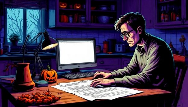 В ночь 31.10.25 в тесной, освещенной лишь светом настольной лампы кухоньке, за столом, скрючившись перед компьютером, сидел Писатель. Все друзья умчались на вечеринку, одевшись в страшные костюмы и в удовольствие разукрасив лица, а он только грустно отшутился от всех предложений, потому что не нашел в себе сил сдвинуться с места. В двери звонили дети, пришедшие «вытрясти» немного вкусных конфет, но даже им он не открывал, хотя приготовленные накануне сладости лежали в вазочке на маленьком столике рядом с дверью.