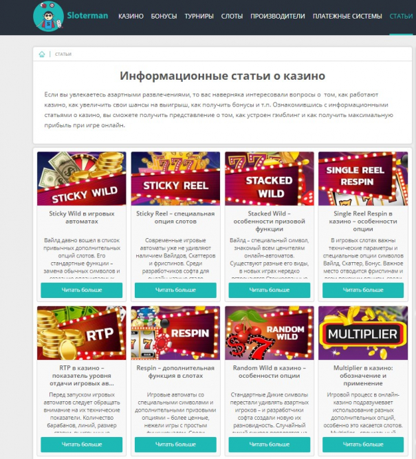 Надежный гид по миру азарта с актуальными обзорами и новостямиПоявление качественного информационного портала с экспертными мнениями профессиональных игроков было объективной необходимостью. Мир гэмблинга стремительно развивается и разбираться во всех тонкостях самостоятельно практически нереально. Даже выбор игрового казино в существующем ассортименте азартных залов превращается в непосильную для одного человека задачу. Причем с высокой долей вероятности профессионалы инфо-портала Sloterman уже протестировали возможности игрового казино и опубликовали экспертное заключение, изучить которое можно абсолютно бесплатно. Еще один всегда актуальный и постоянно изменяющийся вопрос — новости. В азартной индустрии постоянно появляются новые казино, происходят презентации автоматов, срываются джекпоты, раздаются бонусы для посетителей игровых залов и происходит множество других актуальных событий. Быть в курсе наиболее интересных фактов поможет портал Sloterman, где публикуются: