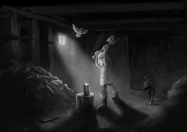 Старик грустно глянул в тёмный угол с соломой, где недавно сидел голубь, затем перевёл взгляд на окошко, в которое птица выпорхнула, и глубоко вздохнув, наклонился за охапкой дров.