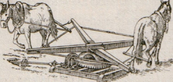 Так что принял для пилорамы обычные пилы из полотна, только не одну, а три — распиливать бревно за один проход на четыре доски. Две из них будут деловыми — для столярных работ, а две, крайние — для прочих нужд. Пилы при том соединил пакетом в общей рамке, с вертикальным перемещением — из условия, что бревно подается горизонтально по желобу. В приводе пакета пил использовал шатунный механизм, а для вращение его вала предусмотрел разные варианты движителя — водяного колеса, конного ворота, ветряных крыльев. Для первого станка выбрал самый доступный вариант — конный, от него спроектировал все узлы и детали.