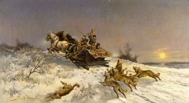 После того, как каждый занял свое место на полудуге вокруг холма с наветренной стороны, двое потащили наверх мешок с чем-то барахтающимся внутри. На самой макушке один из них вбил кол в промерзшую землю, второй же освободил из мешка поросенка, связал одним концом веревки ему ноги, другим за кол. Тот завизжал оглушающе, пытаясь вырваться из пут, невольно призывая голодных хищников. Люди же залегли в складках или за снежным валом, стараясь не встревожить прежде времени осторожных зверей. Долго не пришлось ждать, через четверть часа появились первые волки, с каждой минутой их становилось больше. Никто не стрелял, ждали сигнала старшего, а он все продолжал высматривать — по-видимому, выбирал нужный момент. Уже первый из серых взобрался на верх холма, поросенок заверещал громче прежнего, когда раздался условленный выстрел, за ним другие.