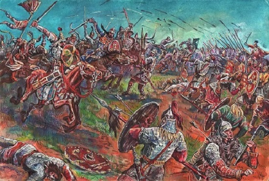 В следующей картине мальчик предстал уже повзрослевшим воином, в каких-то доспехах из кожи и мечом на поясе, в правой руке нес длинное копье, а в другой щит. Он с отрядом из таких же ратников шел куда-то по степи, впереди же на коне с украшенной золотом сбруе ехал вожак в сверкающих на солнце латах и шлеме, его оружие было приторочено к седлу. Откуда-то слева из распадка внезапно выскочила конная группа и на всем ходу помчалась к отряду. По команде вожака воины спешно перестроились в две линии и закрылись щитами от летящих стрел степняков, те же, не сближаясь вплотную, помчались по кругу, продолжая огонь из своих небольших луков. Один за другим ратники падали оземь, пораженные вражеским оружием, собственные лучники, находившиеся во второй линии, не справлялись с нападавшими, хотя и поразили некоторых из них. Сам юноша, за которым наблюдал Лексей, пока еще держался в строю, на его щите висели где-то десяток стрел, часть пробили насквозь, выглядывая острым жалом. В какой-то момент степняки пошли в прямую атаку, разогнавшись, направили своих коней на ощетинившуюся копьями линию. И именно на острие атаки тяжелой конницы оказался юноша, поразил всадника, а его скакун сбил юного воина с ног и ударом копыта выбил дух.