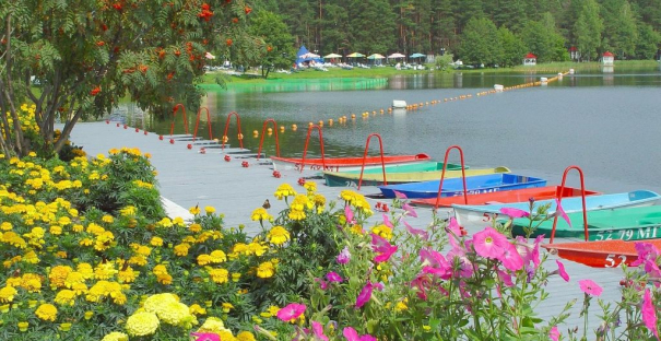 С первого взгляда нам здесь понравилось. Чистые аккуратные дорожки, цветники, вдоль них обустроены беседки и лавочки. Два многоэтажных здания, коттеджный городок, отделенный живой изгородью от остальной территории. Все здания смотрелись нарядно, со свеженанесенной краской разных цветов. На берегу виден просторный пляж с лежаками и зонтами, дальше лодочная станция и водные аттракционы.