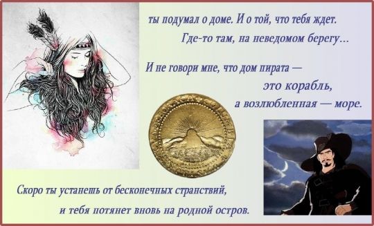 — О чем ты подумал сейчас? Вернее, о ком? Не о трактирных же девках, разносящих снедь?.. Нет, ты подумал о доме. И о той, которая тебя ждет. Где-то там, на неведомом берегу… И не говори мне, будто дом пирата — это корабль, а возлюбленная — море. Скоро ты устанешь от бесконечных странствий, и тебя потянет вновь на родной остров. Но будешь ли ты счастлив там один?..