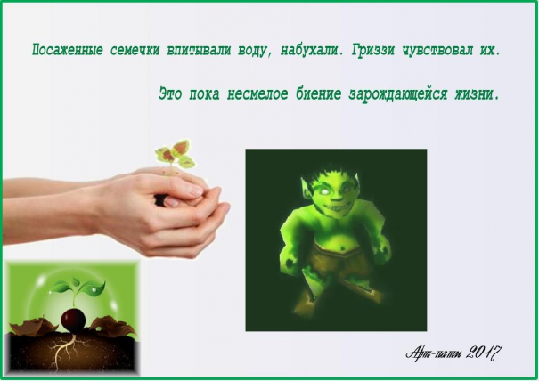 Маленький орк раскрыл сверток и высыпал на ладонь три коричневых зернышка. Учитель травоведения поделился с ним семенами чемониса ― магического ингредиента многих зелий. Гриззи выкопал небольшие ямки и посеял магическую траву. Потом сбегал к колодцу, набрал воды в лейку и обильно полил грядку.