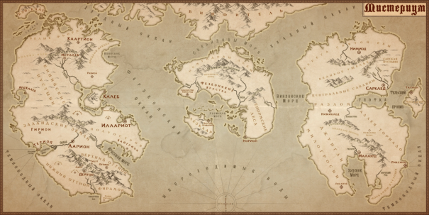 В сии дни, когда большинство мистерианцев не покидает за всю жизнь черты города, мы стали забывать о том, что нашим предкам приходилось странствовать по воде и суше. Из дошедших до нашей эпохи карт, мэтр Густав де Милан собрал упрощенную версию карты планеты Мистериум. — Лига Археологов