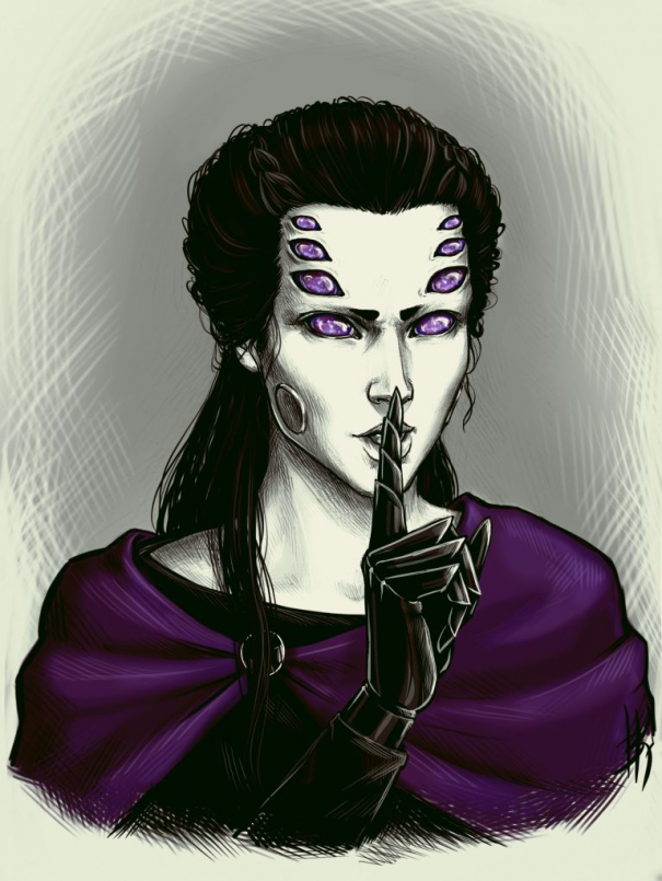 Она подошла ближе, и лиловый свет выхватил из полумрака ее силуэт. Темное бархатное платье изящно лежало по хрупкой фигуре, длинные рукава скрывали тонкие руки, но черные кисти с длинными паучьими пальцами было не спрятать. Бледное лицо, казалось, не хранило в себе ничего, кроме восьми черных бездонных, без зрачка и радужки, глаз. Они были словно в мельчайших осколках лиловых кристаллов, как небо, по которому Берингард пытался свериться. Хозяйка закрыла глаза, и Берингард смог заметить тонкий нос, бесцветные губы и черные спилы хелицер в углах челюсти. Смоляные волосы косами уходили назад, будто нарочно обнажая лоб. Жуткая.