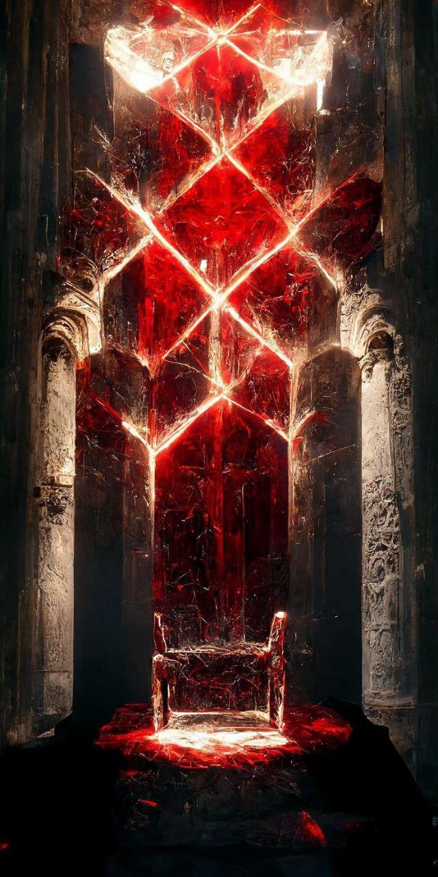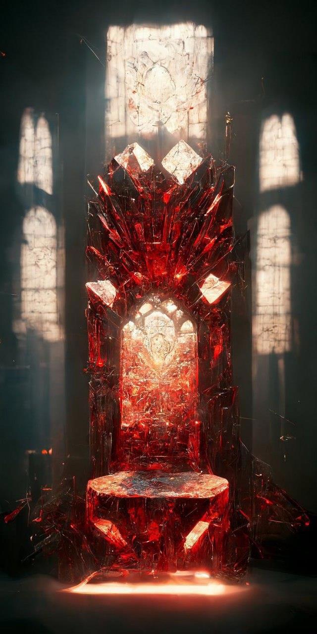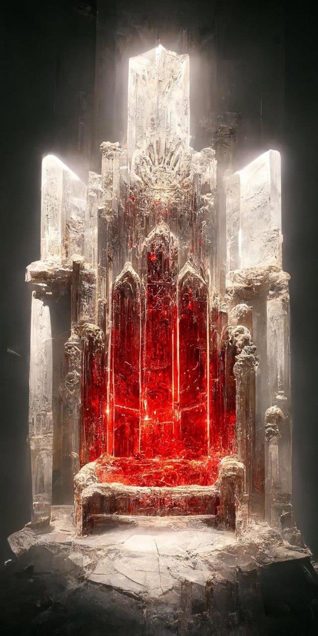 Трон его велик, но в тоже время скромен: основа трона вытесанная из твердой породы серого камня, с минимум украшений, высокое оголовье, большие завёрнутые стенки, словно ограждающие от следящих по бокам, подчёркивая короля, сидение из красного камня, большой пласт красного камня составлял сидение под чресла, части тоньше, формы вытянутого пятиугольника, шли вверх по оголовью, не стройными рядами, и было их ровно шесть! От трона исходило свечение и овеянная скорбью.