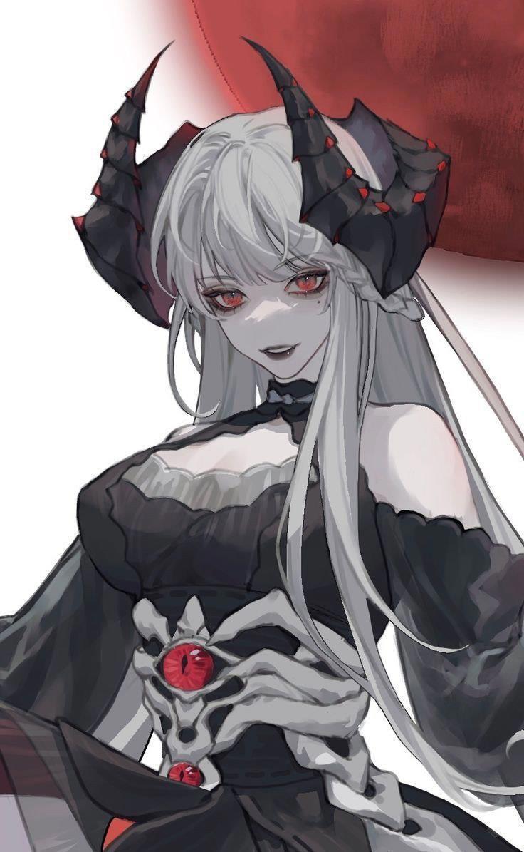 Фигура стройная, груди упругие да пышные, ноги длинные, ровные. Строгие черты лица гармонировали с дурным нравом. Из головы пышно произрастали два закрученных, острых чёрных рога, в рога инкрустированные ограненные красные камеи: чтобы жестокость никогда не покидала её мыслей. Голову также украшала корона цвета стали с голубыми камнями. И камне те сияли бездонным холодом океана.