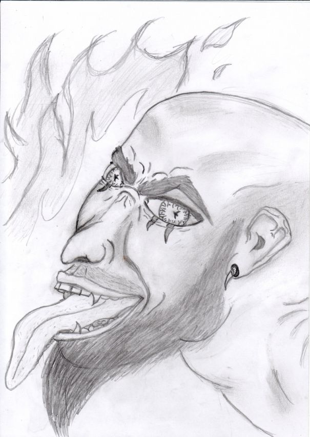 Посреди главной дороги стояло странное полупрозрачное рогатое существо с человеком внутри. Большая голова этого существа была откинута назад, а длинный хвост медленно извивался подобно змее. Рогами оно чуть ли не упиралось в землю. Но больше всего парня испугало даже не само существо, а тот человек внутри. Его лицо было подобно лицу самого дьявола: изогнутые от гнева и агонии брови, застланные кровавой плёнкой глаза, сгорбленный крючковатый нос, который время от времени становился плохо виден из-за высунутого во всю длину языка, мотавшегося из стороны в сторону. До этого момента Альфред при всей своей обычной робости и трусливости даже никогда и подумать не мог о том, что возможно испытывать такую всевыжигающую жуть перед обычным человеком. В том, что это был обычный человек, у юноши почему-то не возникало сомнений. Из его расставленных в разные стороны рук струились серо-синие огни, а рогатое существо лишь досконально повторяло за ним все движения, вплоть до того, что тоже вращало своим раздвоенным на конце языком в такт страшному человеку. От того места, где оно стояло, расходились еле заметные тёмно-розовые волны, но башенной стены замка, у которой находился юноша, они почти не достигали.