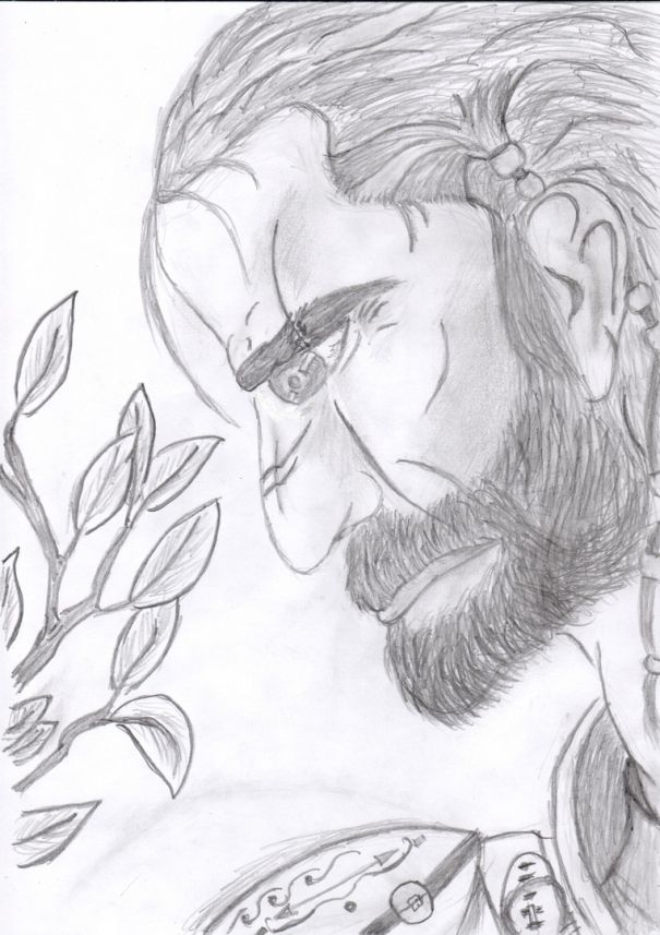 Взошла луна. Лес немного посветлел от её мягкого серебристого света. Набегающий северный ветер время от времени раскачивал высокие сосны, и тогда их треск раздавался эхом по всей округе. Откуда-то доносилась прерывистая трель соловья. К небольшому родничку, струившемуся сквозь заросли дичника, подошла напиться воды осторожная лиса. Огромная сова, заметившая что-то на земле, мягко и плавно слетела с ветки дуба. На поляне за родником догорал маленький огонёк. Его неровный свет выдавал фигуру сидящего рядом одинокого человека. Человек был одет в странный кожаный доспех. Доспех имел стандартные, хотя и давно уже устаревшие воинские наплечники с загнутыми вниз острыми краями. Каждый наплечник состоял из двух металлических половинок и был обрамлён по краям красивыми узорами. Грудная и спинная части доспеха во многих местах тоже имели металлические вставки, что защищало его обладателя от открытых ударов, хотя и не давало ему полной защиты. Также весь доспех был снабжён ремешками с кармашками, которые отчасти превращали его в универсальную сумку для путешественников. Левая рука человека лежала на ещё более странном составном луке со сложной металлической рукоятью и изогнутыми плечами, похожими на те, что использовали в своих луках народы дальних пустошей. Тетива была сделана из чего-то тёмного, а у каждого конца к загнутым наконечникам лука, за которые она крепилась, было привязано по паре невесомых перьев. В тетиву была вложена одна стрела. Её зубчатый наконечник время от времени поблёскивал от всполохов догорающего костра. Это была аккуратная, но всё же самая обычная стрела с белым гусиным пером, что само по себе сильно выделялось на фоне такой необычной амуниции. Рядом с луком в траве лежал и колчан, сделанный из дорогого меха северного волка, а также небольшая серая сума с длинным ремешком, наполовину пропитанная кровью. Человек сидел, выдвинув вперёд одну ногу, согнув другую в колене. Опираясь на колено правой рукой, он вяло ворошил угли в костре длинной веткой. Левая рука его оставалась покоиться на луке. Лицо человека было давно не брито. Ото лба до щеки через весь правый глаз у него проходил узкий шрам, и ещё два небольших шрама были видны у него на переносице. Ветер слегка потрагивал его длинные с проседью волосы, всё ещё влажные от того, что недавно ему пришлось переплывать реку. Взгляд человека таил в себе глубокие раздумья. Иногда человек немного оживал, оглядывался по сторонам, но потом снова уходил в себя.