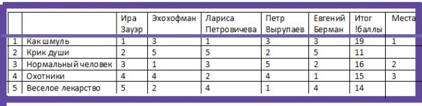 При таком разительном расхождении мнений судей я решила применить к подсчету баллов "салфеточный" принцип. Первое место — 5 баллов… пятое место-1 балл.