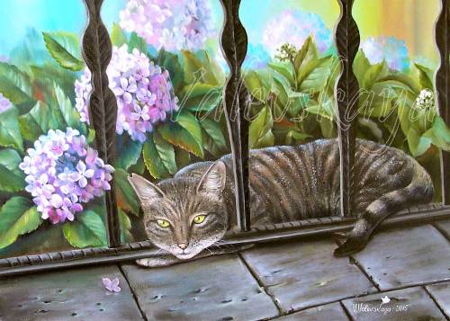 Валентина Валевская — "Кот и гортензия" — холст, масло