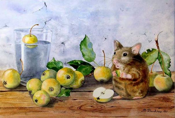 Наш общий домашний любимец Хомка постоянно что-то жуёт — его пухлые щёчки так и ходят ходуном без остановки. И как только ему не надоедает? Просто самая настоящая жевательная машина! Шустрому проказнику очень нравятся всевозможные ягоды, хрустящие сухарики, морковь, сухофрукты, а ещё — зёрнышки, горох, фасоль и многое другое, что можно грызть целыми днями и собирать про запас, напихивая за пухлые щёки. Но больше всего на свете хомячок почему-то любит маленькие райские яблочки. Да что там говорить — он их просто обожает. Когда бабушка в начале осени привозит с дачи собранный урожай, Хомка уж тут как тут. Потешно поводя носиком из стороны в сторону, он нетерпеливо принюхивается, с наслаждением вдыхая свежий аромат, а затем быстро взбирается на стол. Там хомячок располагается основательно — усаживается пушистым столбиком, покрепче зажимает в маленьких лапках ломтик сочного яблочка, отрезанного для него заботливой бабулей, и начинает быстро-быстро дробить его зубками на мелкие кусочки. При этом он не забывает зорко поглядывать по сторонам — как бы кто без спросу ничего не стащил. Судя по всему, наш хомячок абсолютно уверен, что все яблочки в доме принадлежат лично ему, или, уж по крайней мере, он имеет на них самое наипервейшее право. Об одном только немного сожалеет Хомка: хоть райские яблочки и малюсенькие, а за щёки всё равно не помещаются…