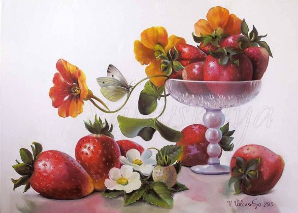 Валентина Валевская — "Клубника в настурциях" — холст, масло