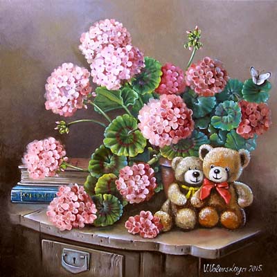 Валентина Валевская "Герань и медвежата" — холст, масло