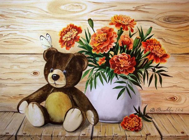 акварель "Плюшевый Миша с бархатцами" — Валентина Валевская