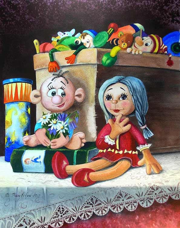 У маленькой девочки Вероники есть любимая кукла Маша. Её к Новому году подарила лучшая подруга мамы, которая работает мастером по изготовлению игрушек в кукольном театре. Она нарядила Машу в алое платьице с белыми отложными манжетами, планочкой и пояском в виде бантиков и такие же в тон туфельки. А волосы у куклы совершенно необыкновенного серовато-голубого оттенка. Но самое замечательное — это её нежная, чуть загадочная улыбка. Наверное, поэтому кукла всем очень нравится, а маленькая девочка в ней просто души не чает.
