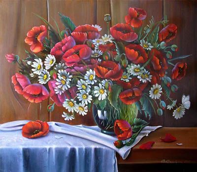 Валентина Валевская — "Ромашки с маками" холст, масло
