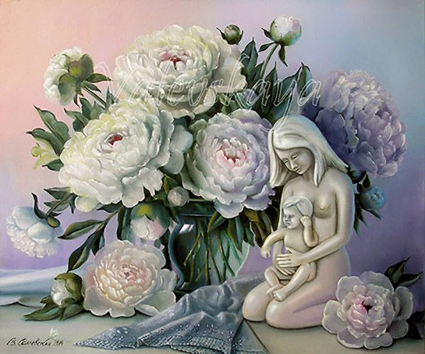 Непередаваемый аромат прохладной свежести, напитанной едва заметной сладостной влагой, струится по комнате, успокаивая и очаровывая, подобно мелодии чудесного вальса. Фарфоровая статуэтка женщины и ребёнка, доверчиво устроившегося в добрых и ласковых руках матери, символизирует покой и уют семейного очага. И пусть так будет всегда под сенью белых пионов.